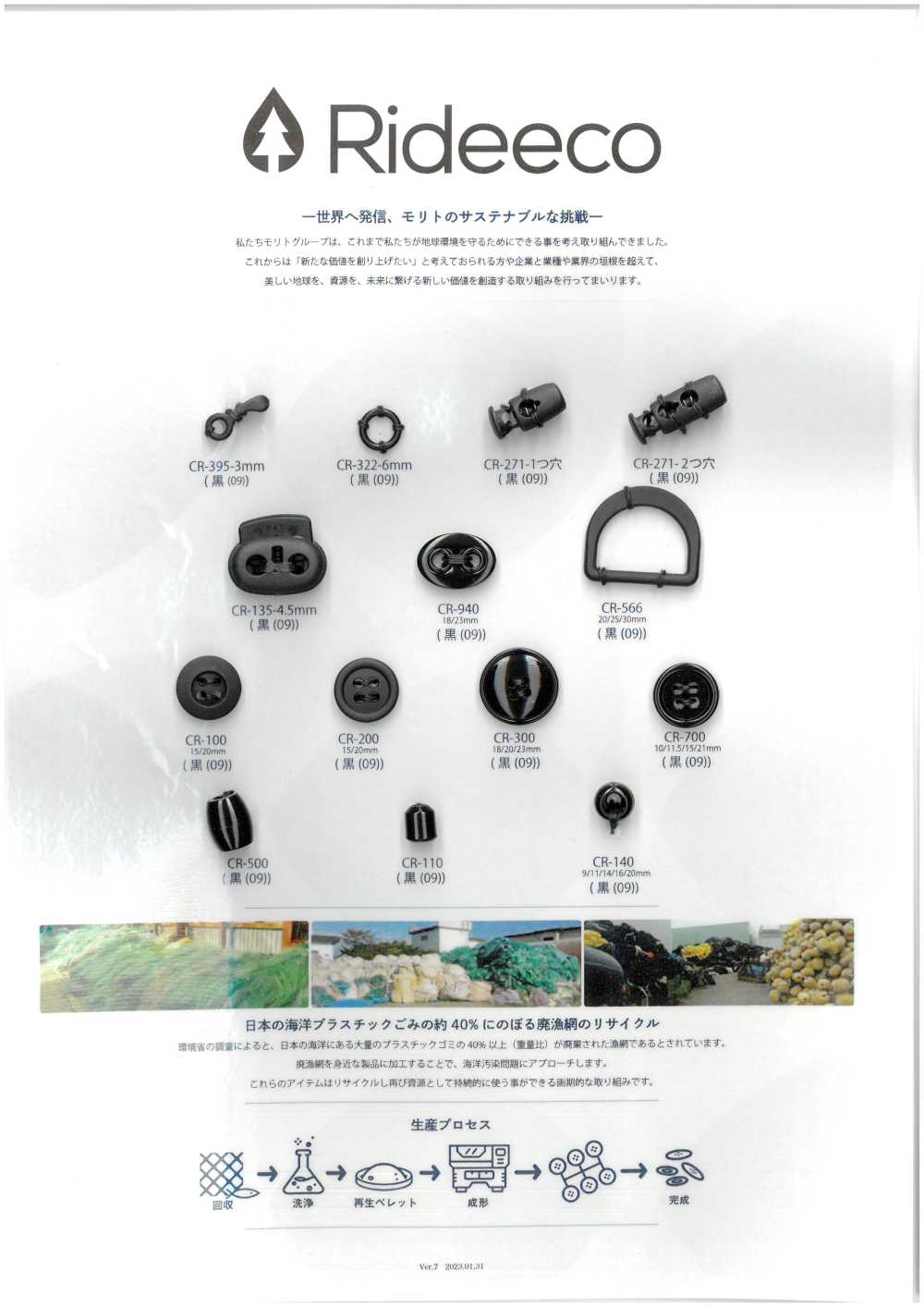 Các hạt nylon tái chế sau đó được đúc phun tại các cơ sở đúc của Morito ở Nhật Bản, Trung Quốc, Đông Nam Á, v.v. và được sản xuất thành các vật liệu phụ trợ như cúc, nút chặn và mặt thắt lưng.